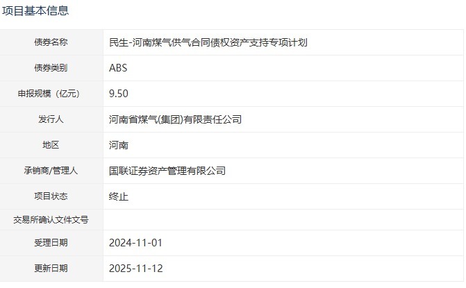【大河财立方消息】11月13日,据深交所披露,民生-河南煤气供气合同债权资产支持专项计划项目状态更新为“终止”,拟发行金额为9.5亿元汇盈配资,品种为ABS,承销商/管理人为国联证券资产管理有限公司,受理日期为2024年11月1日。