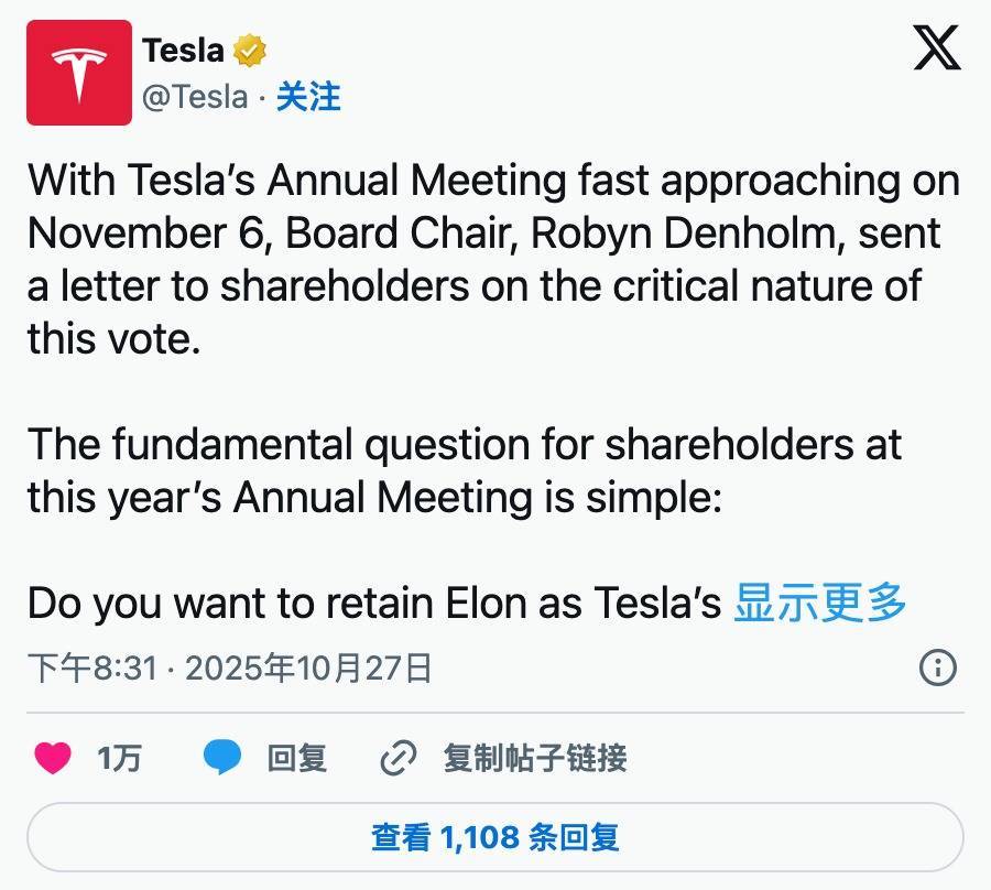 三天前,特斯拉股东投票通过了埃隆·马斯克新的巨额薪酬方案,相比2024年500亿美元的提议,这一次的金额预计高达1万亿美元,这是有史以来给予首席执行官的最高薪酬,而超过75%的股东投了赞成票。