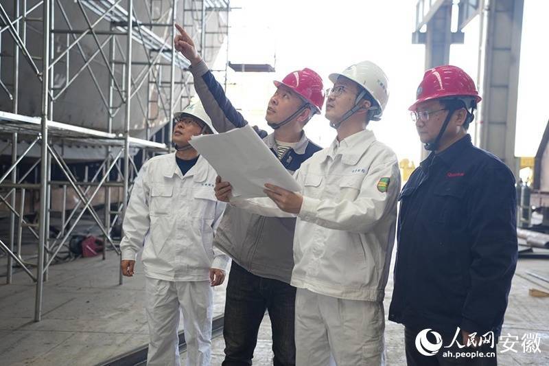 肖华山(右二)正在对船舶建造过程进行检查。人民网记者 王锐摄