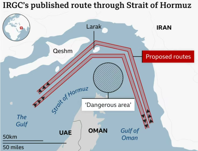 伊朗军方并且警告:“任何船只不论类别,均不得离开其在波斯湾和阿曼海的停泊位置;任何试图接近霍尔木兹海峡的行为,都将被视为与敌方合作,将被列为打击目标。”