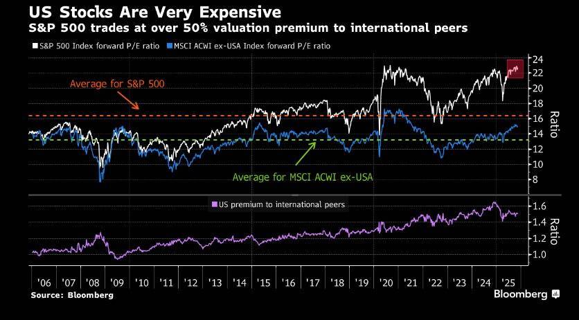 以美元计价,2025年标普500指数的表现落后于大多数地区。明年全球盈利增长预计将趋同,这使得该基准指数的吸引力进一步下降。其远期市盈率已飙升至23倍,相当于疫情后的峰值,且接近互联网泡沫前夕的纪录高位。