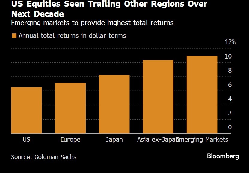 奥本海默及其团队建议,投资者应跳出美国市场、增加多元配置,因为过高的股票估值将限制涨幅。他们预测,未来十年标普500指数(SPX)的年化回报率将为6.5%,在所有地区中表现最弱。新兴市场预计将成为最强劲的市场,年化回报率达10.9%。