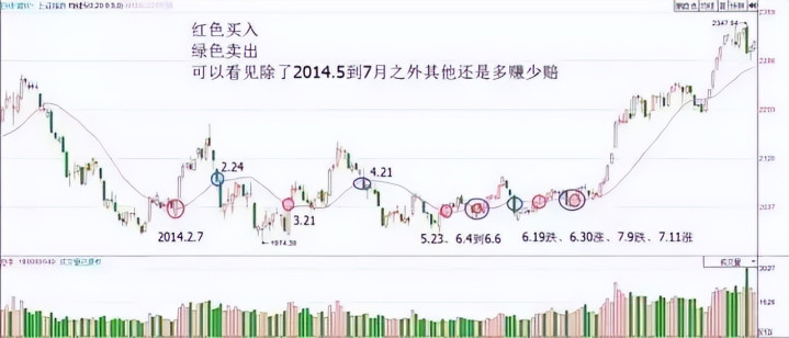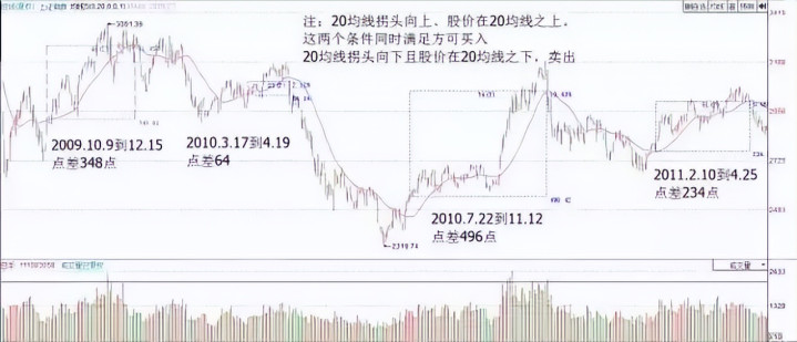 3、20均线的劣势:在震荡市中,多赚少赔、赚赔各半。