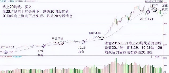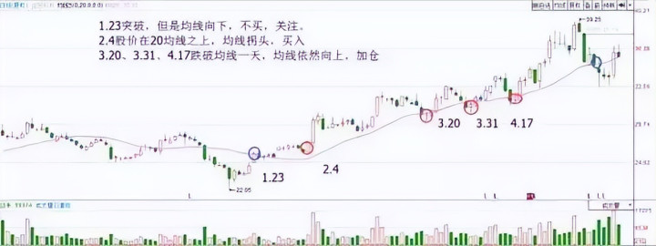 当20均线向上时股价回踩到20日线附近或者跌破20均线并迅速收回,而且成交量并不大。股份在回调后获得20日均线支撑是加仓的最好时机。