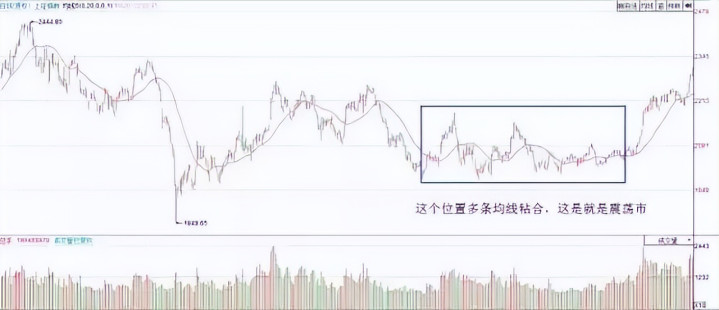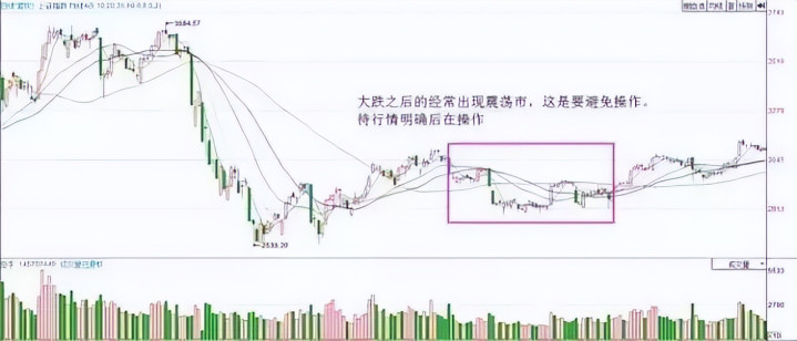 震荡市经常出现在一波大跌之后,或者是一波大涨之后。大涨之后的是卖出的信号,这里我们不讨论。在一波下跌之后经常会出现震荡市盘底,而且在接近变盘时震荡越频繁。