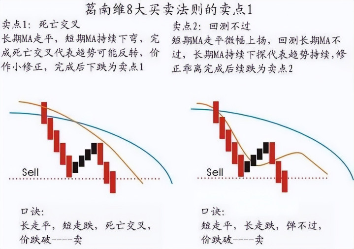 ① 卖1:移动平均线从上升转为平缓,并有转下趋势,而股价线也从其上方下落,跌破了移动平均线,这是第一个卖出讯号。